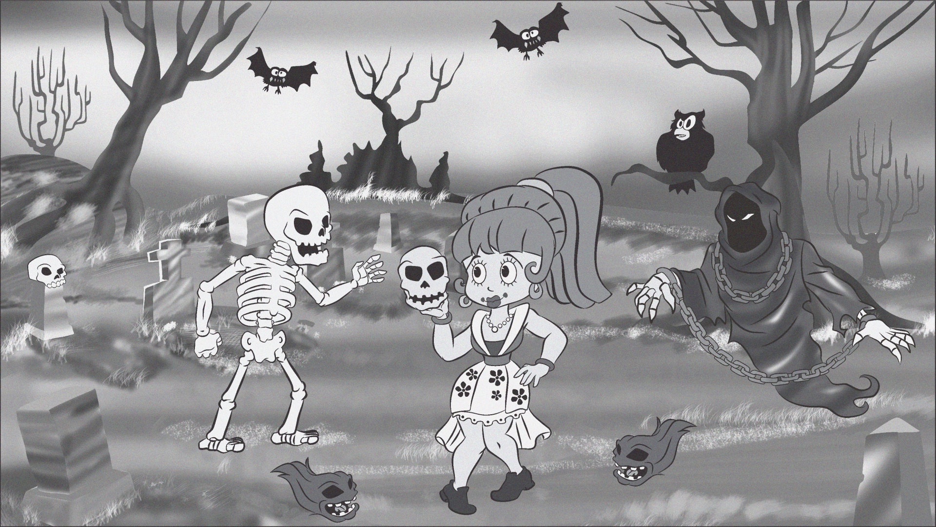 Description: My inspiration for this art was the 1930’s cartoons, i really think that they are really creepy and awsome, and i wanted to prest my tribute to “the skeletons dance” from 1929 ( a disney cartoon ), but the characters are prettier when they pose to the camera instead of randomly dance.