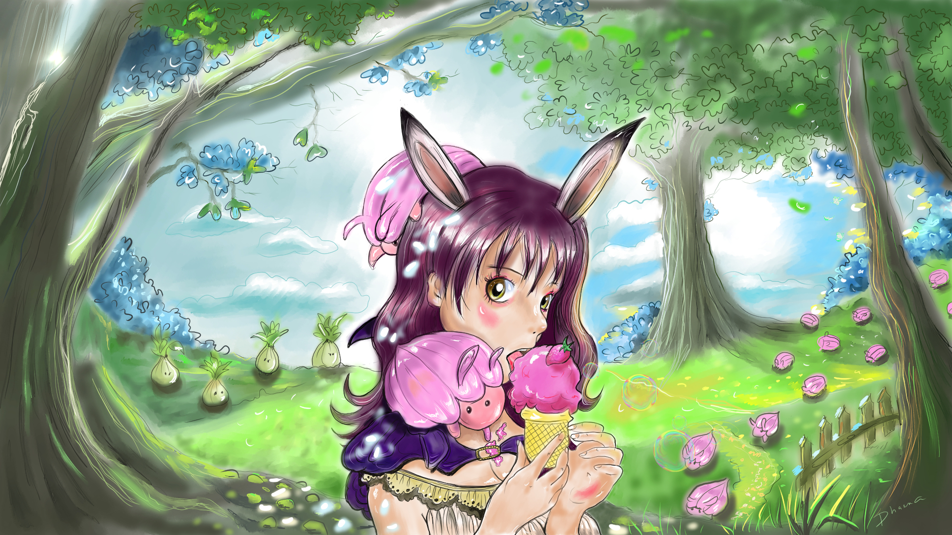 This is a wizard girl, she is very young and cute, full of hopes and dreams. You can see her in West Siauliai forest eating ice cream with strawberries! And little pink Hanamigs will be happy to get some sweet ice cream also! Sun is shining, but it is so nice to be in shadow of Tree of Savior. What can be better for summer day?