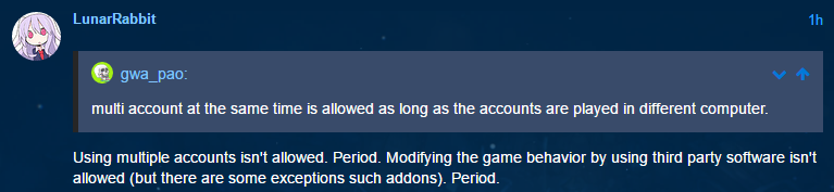 Lol that Multiple account argument XD. We know for sure that argument is bs, you can own multiple pc laptop at home and create different steam account for each play ToS on all of them if you can afford with your two hands. I’m not sure what’s wrong with that unless you can’t afford… then you are just envious of other people. “i can’t do that, don’t let others do that it’s unfair huhuhu”.