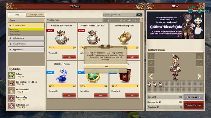 However, if you do receive a message about reaching the monthly TP spending limit and would like it to be removed, please send in a Support Ticket under āPaymentā >> āReset TP Spending Limitā