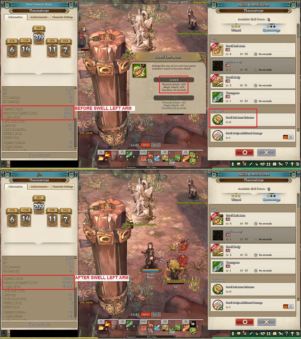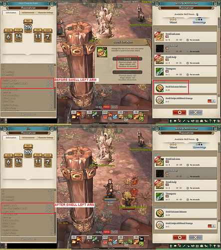 - Cast Swell Left Arm and observe the stat change