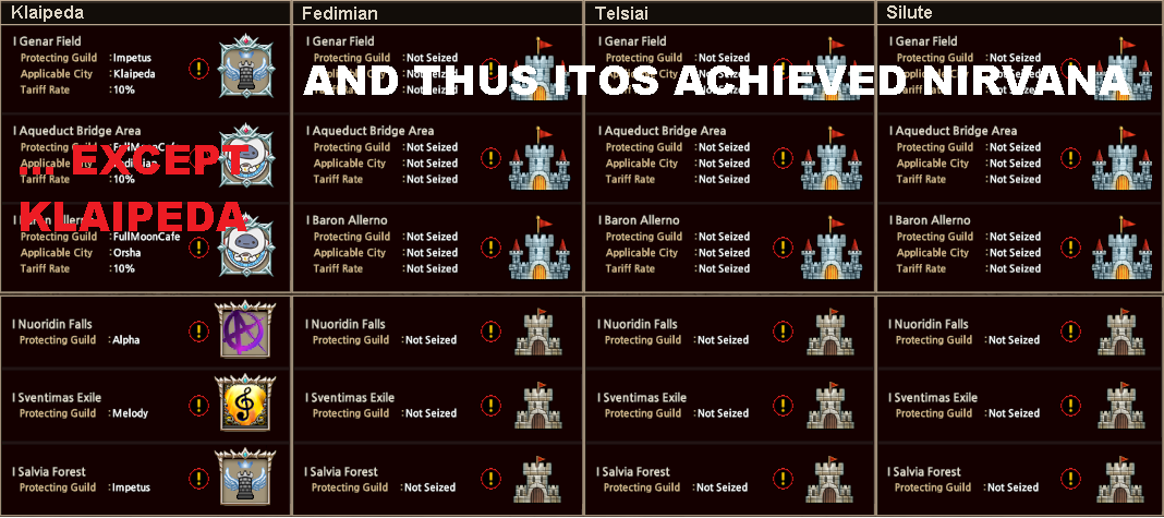 Jokes aside, seems like a bug happened where every server but Klaipeda were unable to capture territory as the tower you interact with itself isn’t open, probably because “it isn’t time yet”. With how IMC loves coordinating their server times with NA, I’m assuming that its a timezone issue once again where IMC probably set the opening times according to NA and put that setting on the other servers. This problem sounds familiar, doesn’t it …