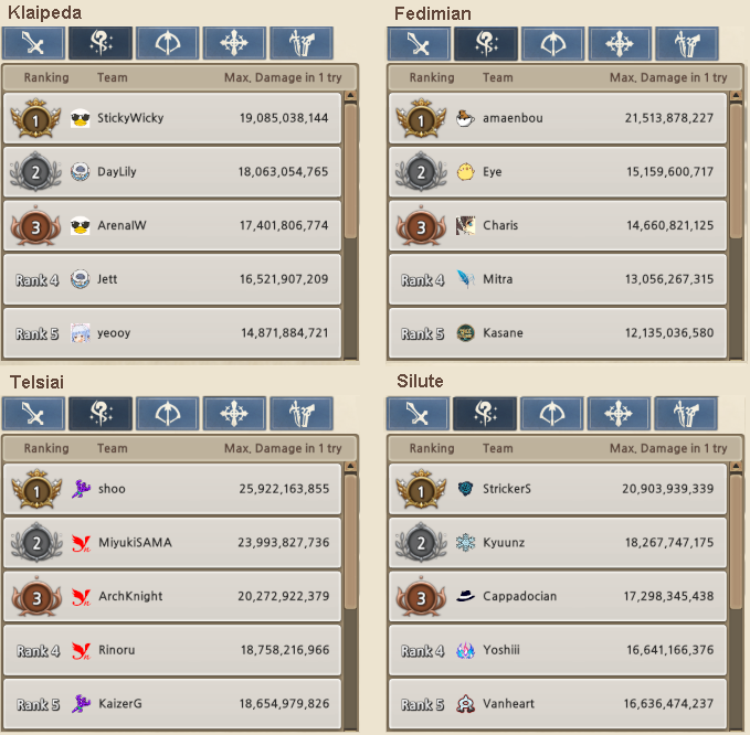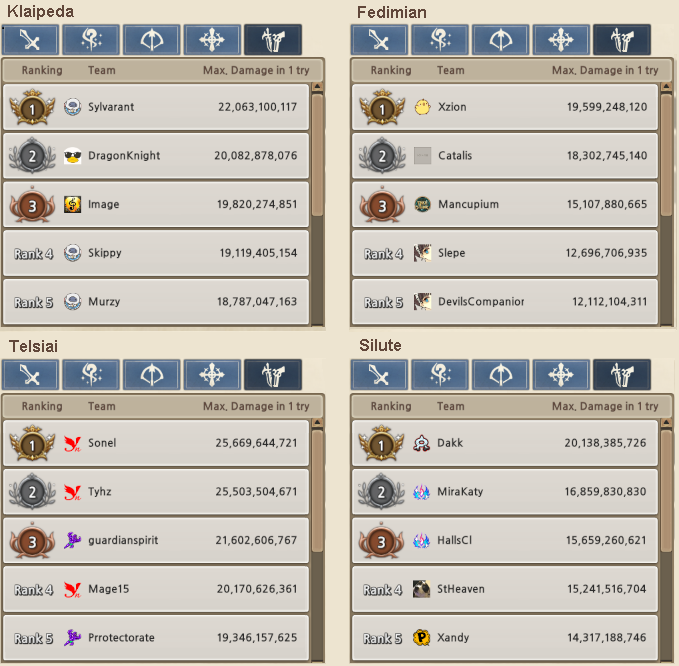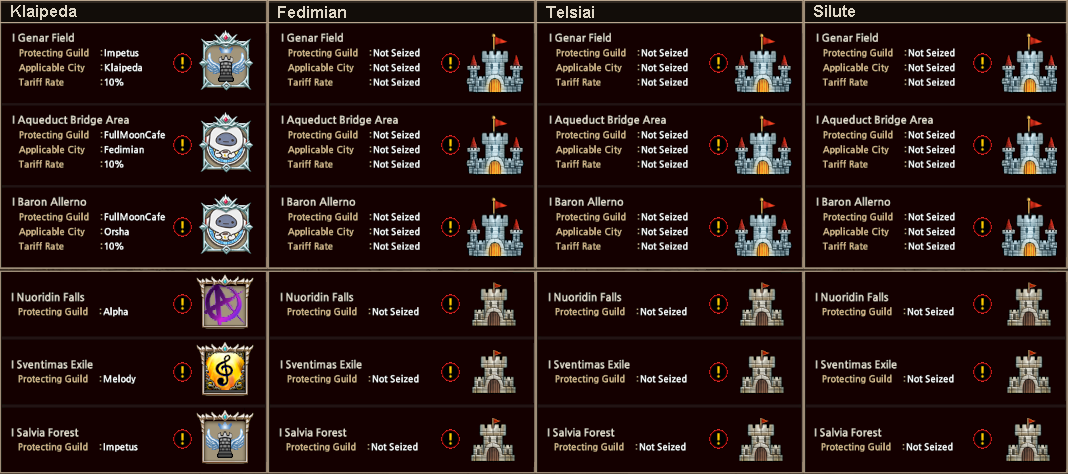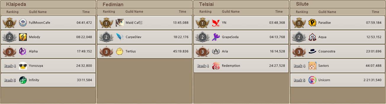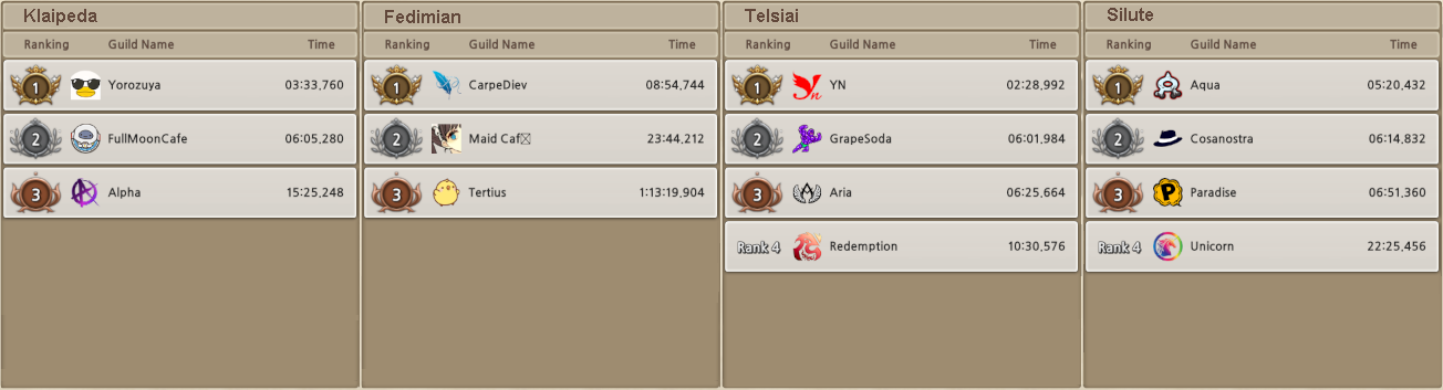 Welcome to your weekly dose of info round-up on Guild Territory Wars, Boruta Guild Raids, Giltine Guild Raids and Weekly Boss Raids on every server! In here, I will be doing on covering on all servers, Klaipeda, Fedimian, Telsiai, Silute and any new happenings in Tree of Savior every week on Monday/Tuesday!