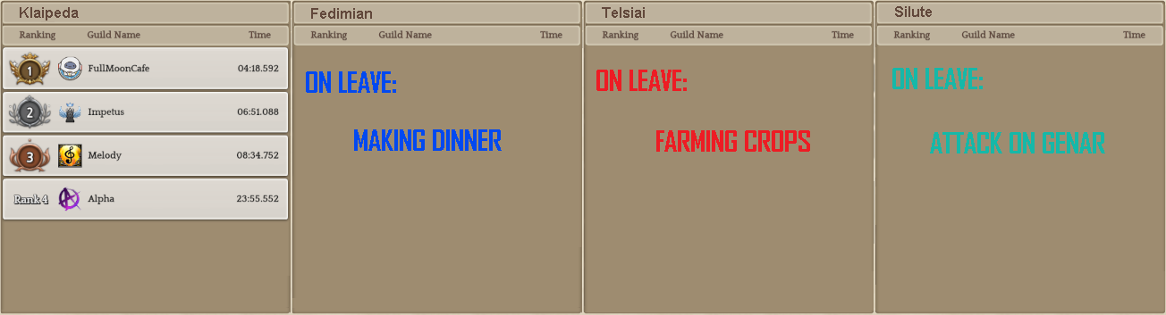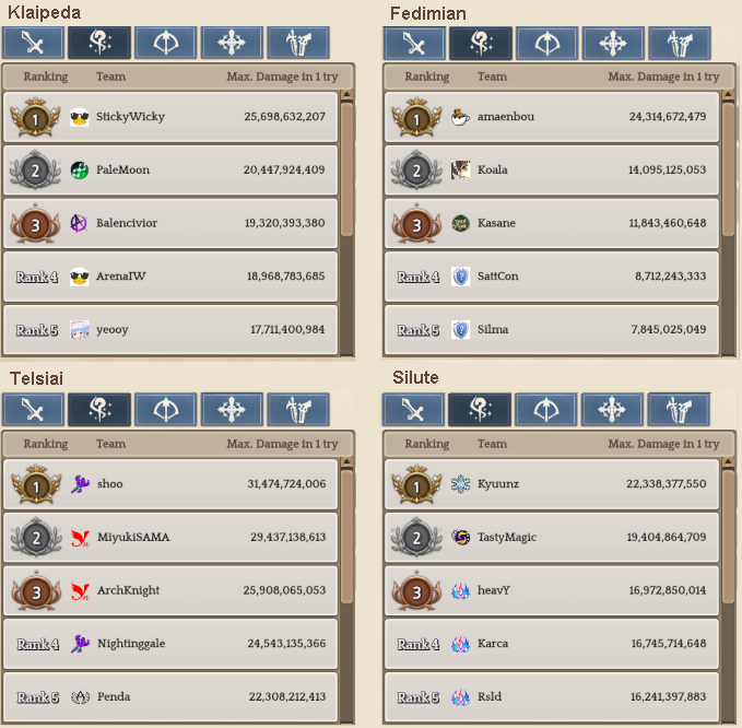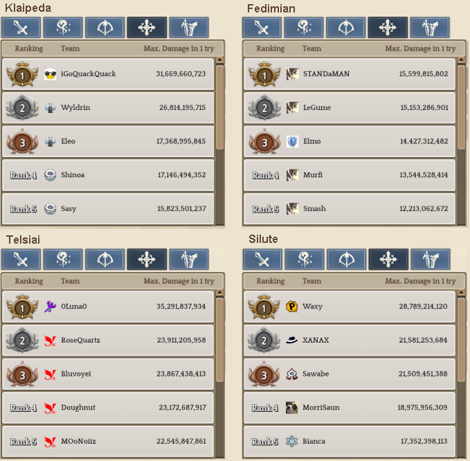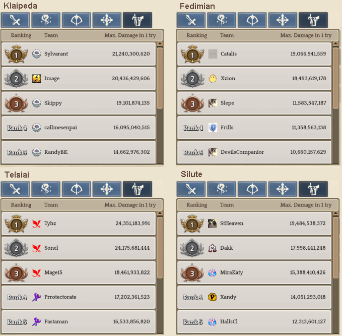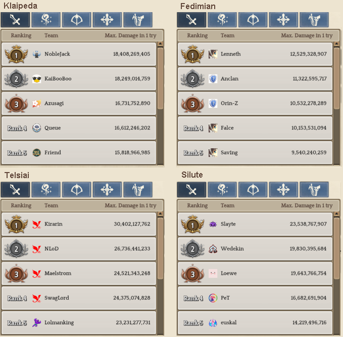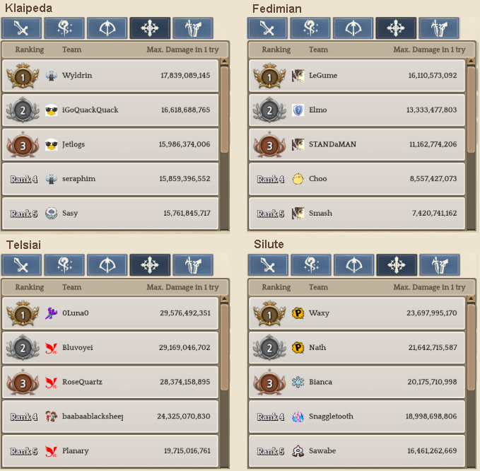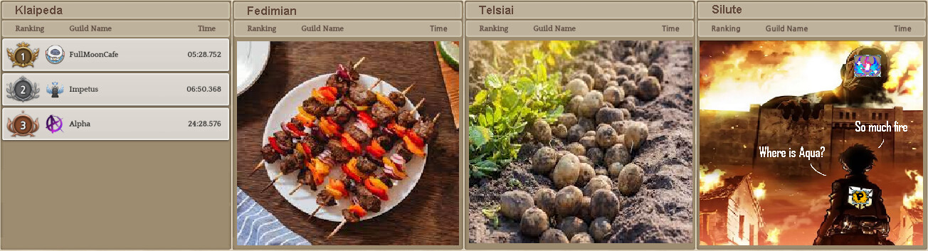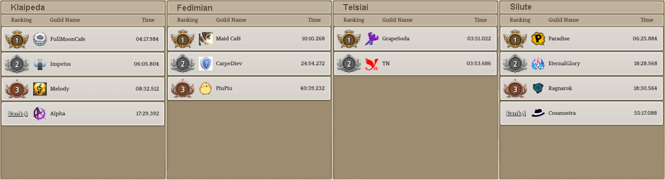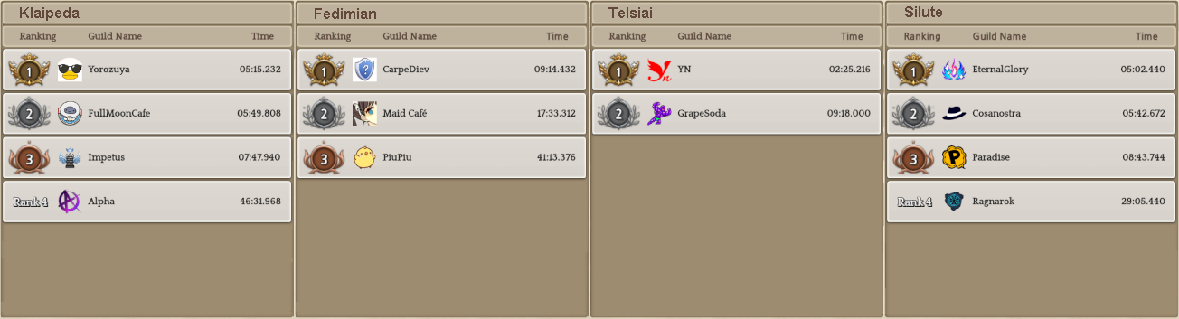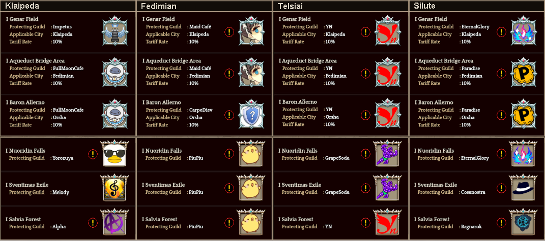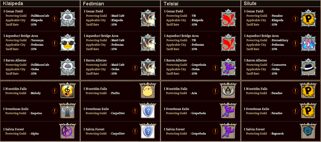 Welcome to your weekly dose of info round-up on Guild Territory Wars, Boruta Guild Raids, Giltine Guild Raids and Weekly Boss Raids on every server! In here, I will be doing on covering on all servers, Klaipeda, Fedimian, Telsiai, Silute and any new happenings in Tree of Savior every week on Monday/Tuesday!