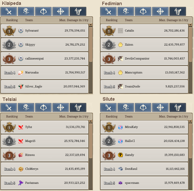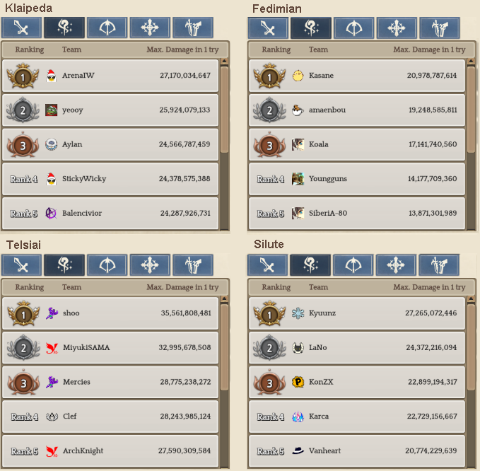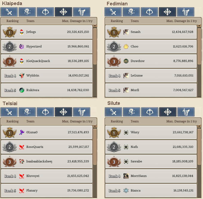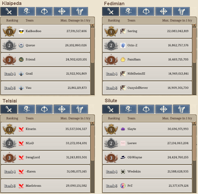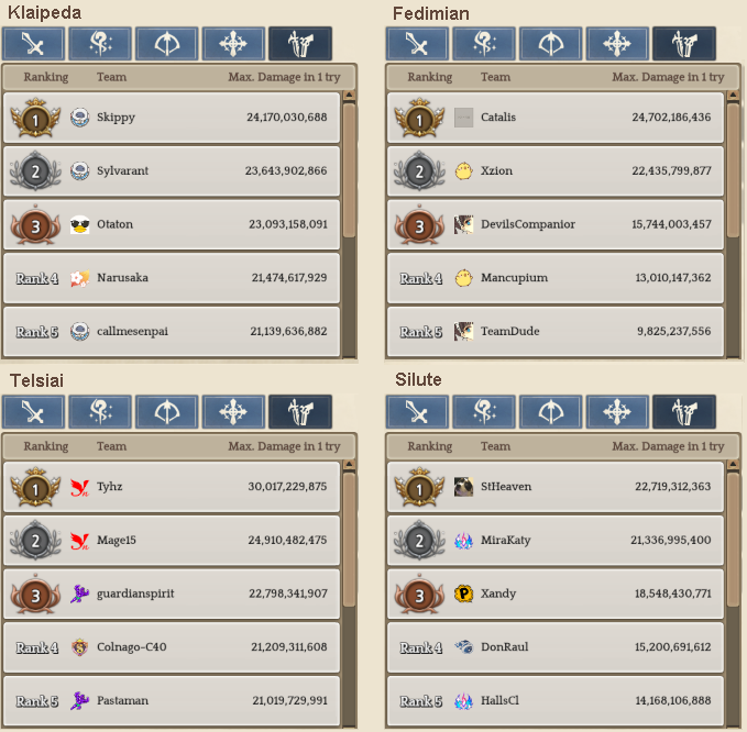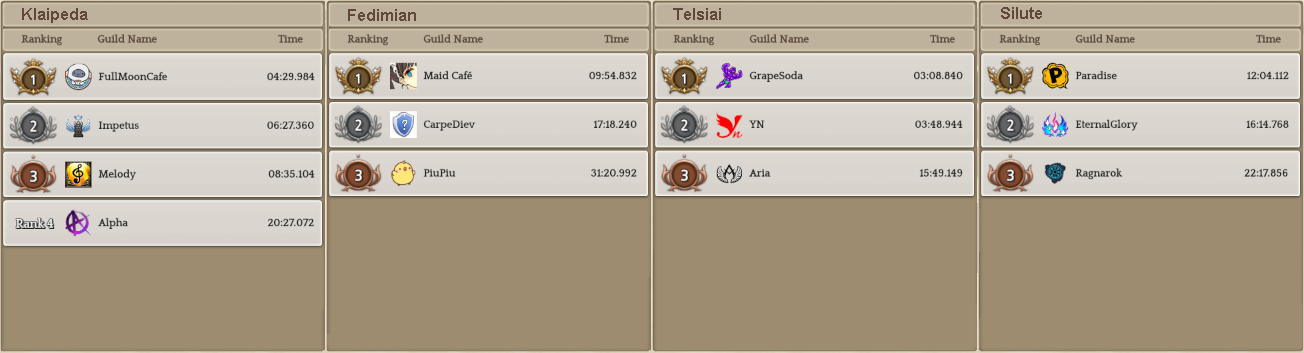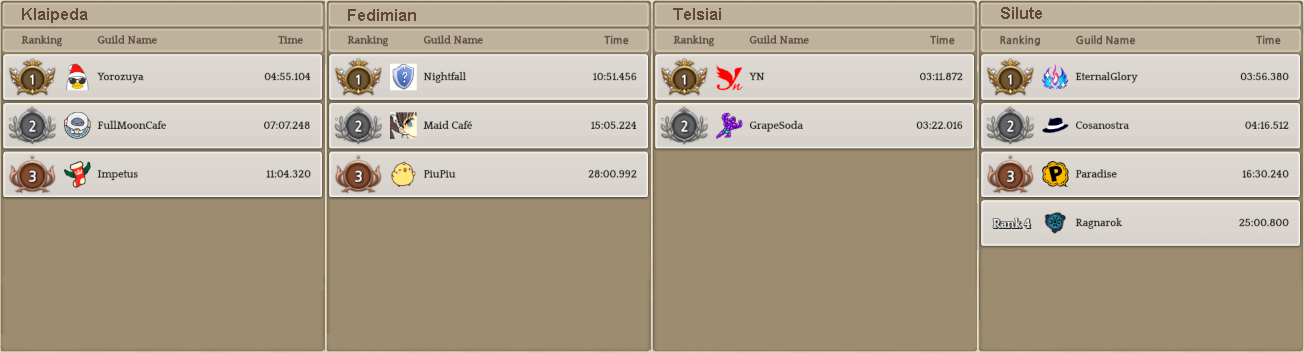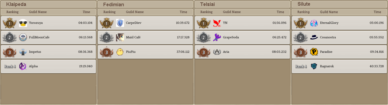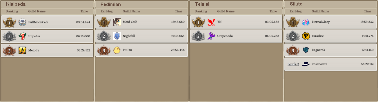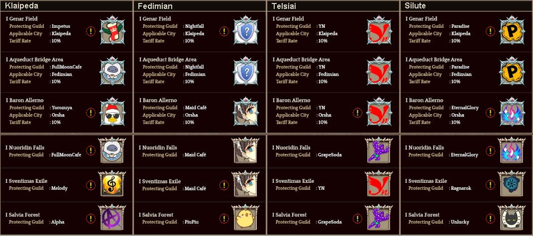 Welcome to your weekly dose of info round-up on Guild Territory Wars, Boruta Guild Raids, Giltine Guild Raids and Weekly Boss Raids on every server! In here, I will be doing on covering on all servers, Klaipeda, Fedimian, Telsiai, Silute and any new happenings in Tree of Savior every week on Monday/Tuesday!