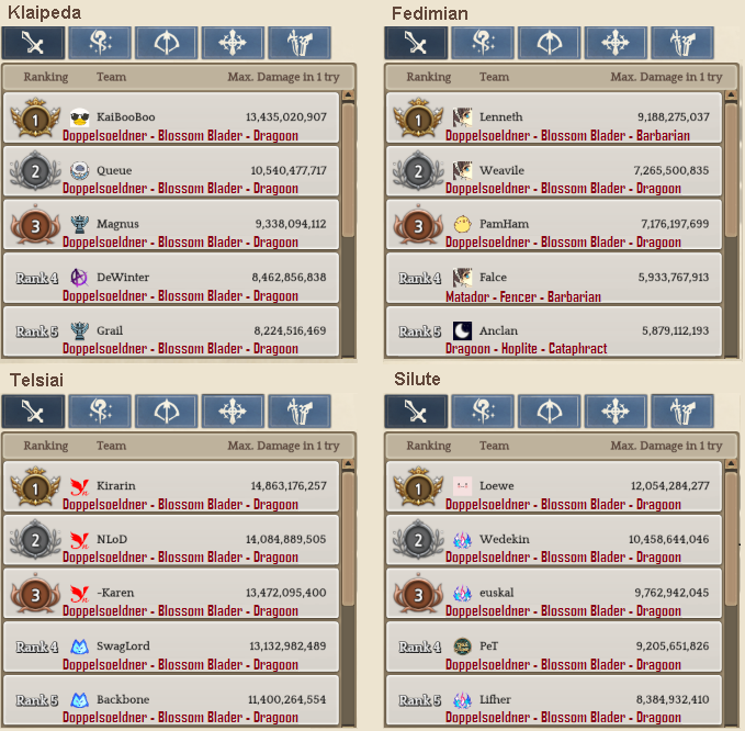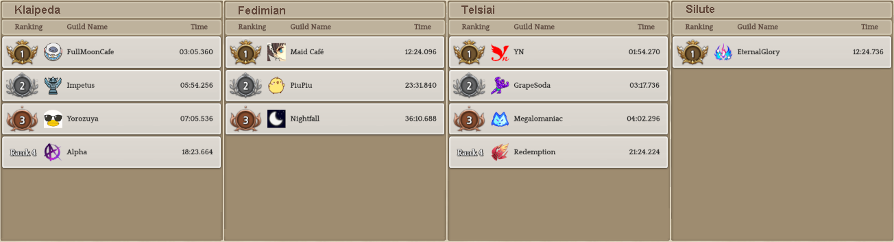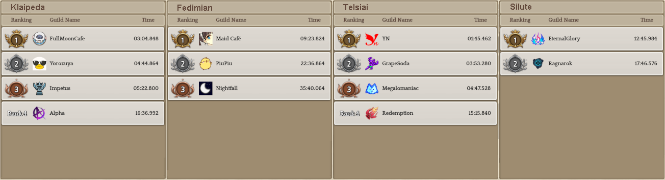 Welcome to your weekly dose of info round-up on Guild Territory Wars, Boruta Guild Raids, Giltine Guild Raids and Weekly Boss Raids on every server! In here, I will be doing on covering on all servers, Klaipeda, Fedimian, Telsiai, Silute and any new happenings in Tree of Savior every week on Monday/Tuesday!