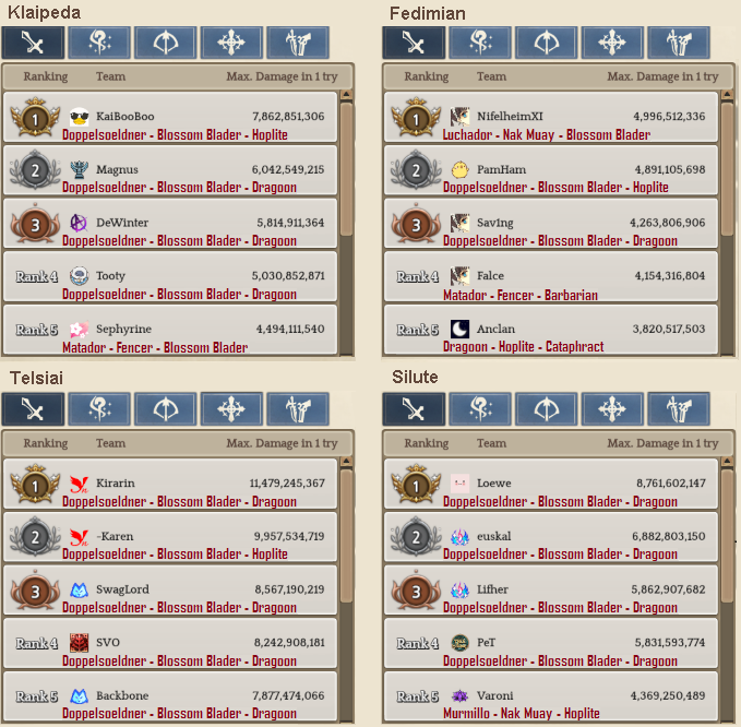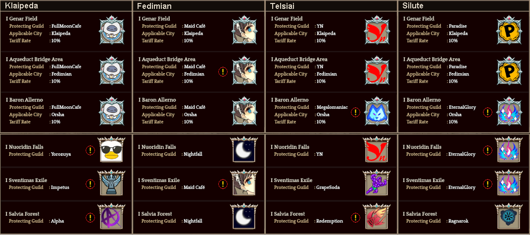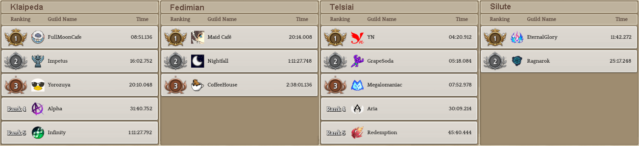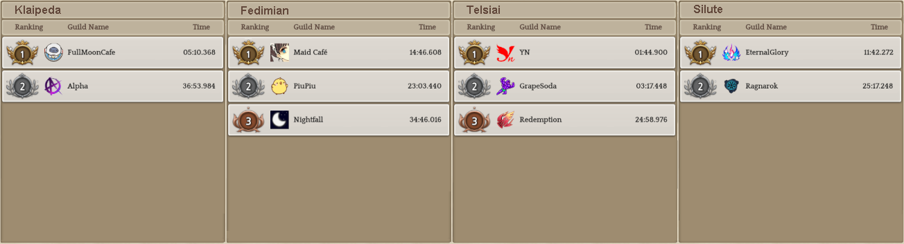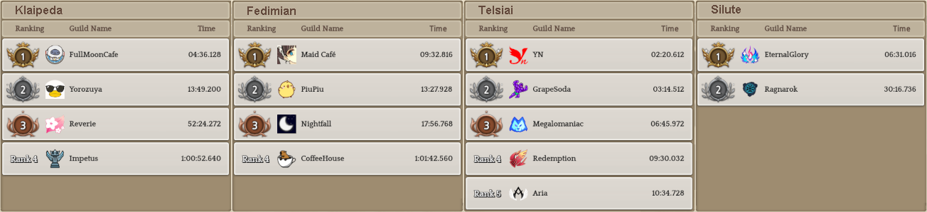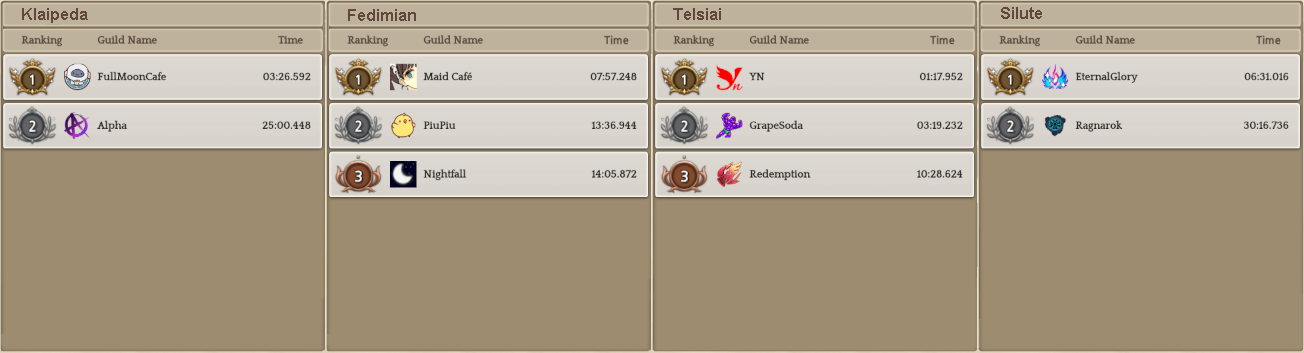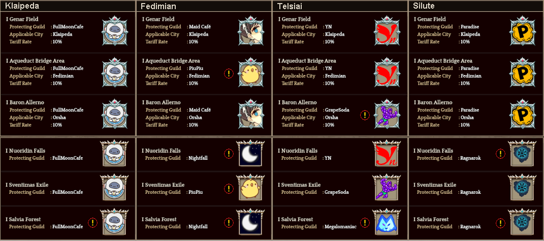 Welcome to your weekly dose of info round-up on Guild Territory Wars, Boruta Guild Raids, Giltine Guild Raids and Weekly Boss Raids on every server! In here, I will be doing on covering on all servers, Klaipeda, Fedimian, Telsiai, Silute and any new happenings in Tree of Savior every week on Monday/Tuesday!