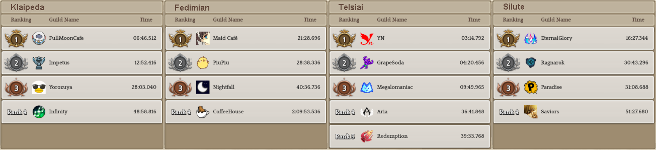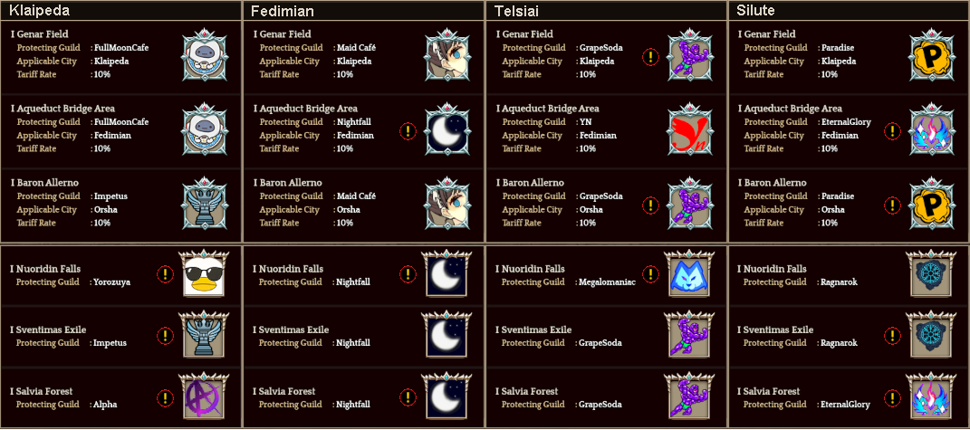 Welcome to your weekly dose of info round-up on Guild Territory Wars, Boruta Guild Raids, Giltine Guild Raids and Weekly Boss Raids on every server! In here, I will be doing on covering on all servers, Klaipeda, Fedimian, Telsiai, Silute and any new happenings in Tree of Savior every week on Monday/Tuesday!