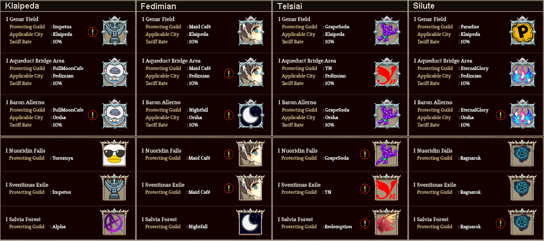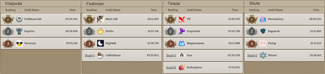 Welcome to your weekly dose of info round-up on Guild Territory Wars, Boruta Guild Raids, Giltine Guild Raids and Weekly Boss Raids on every server! In here, I will be doing on covering on all servers, Klaipeda, Fedimian, Telsiai, Silute and any new happenings in Tree of Savior every week on Monday/Tuesday!