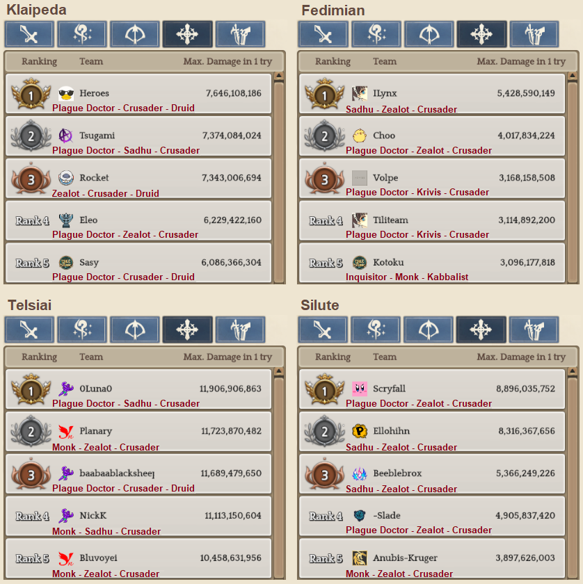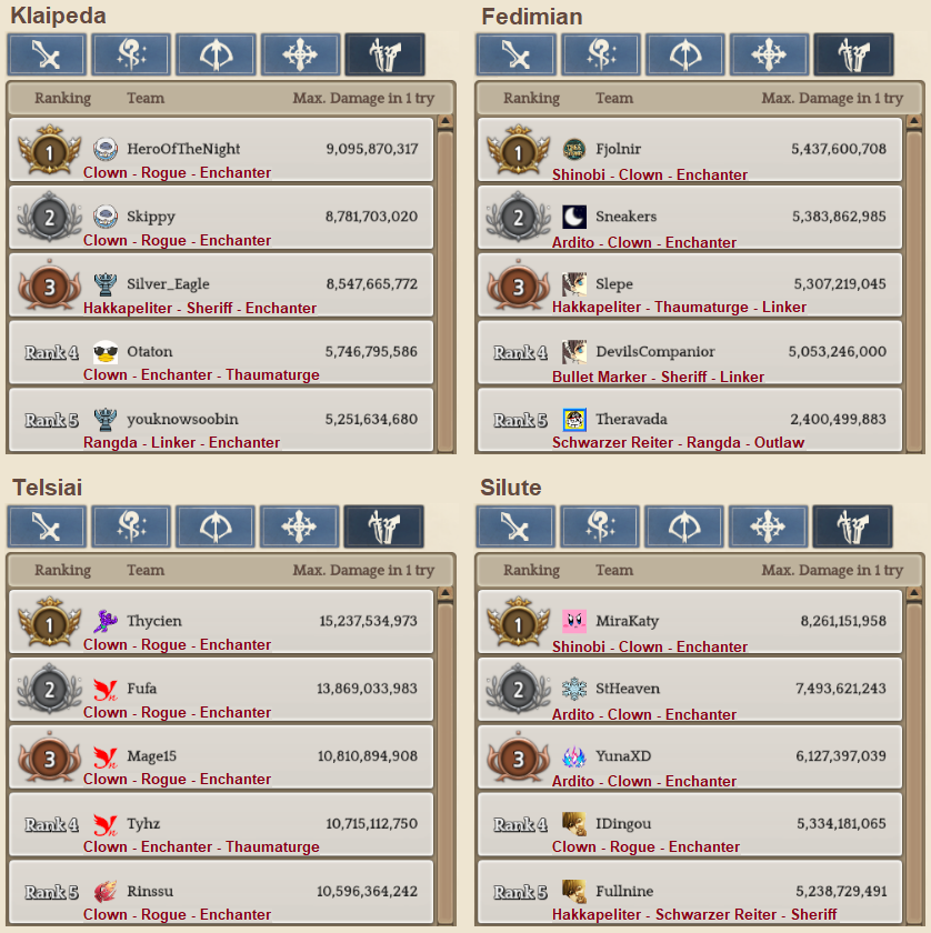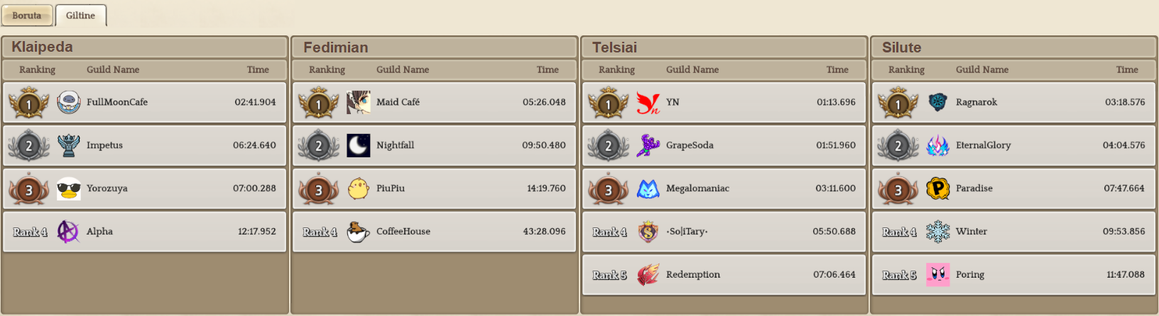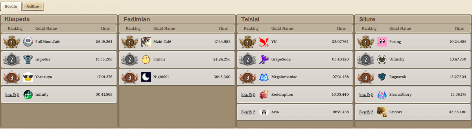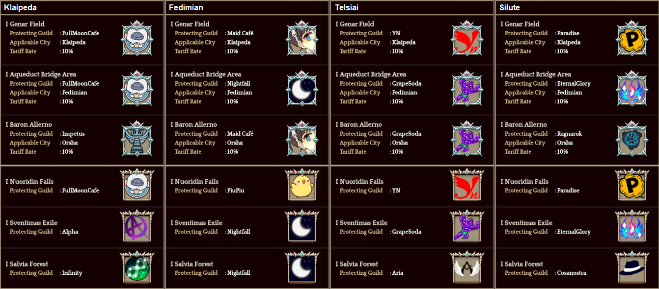 Welcome to your weekly dose of info round-up on Guild Territory Wars, Boruta Guild Raids, Giltine Guild Raids and Weekly Boss Raids on every server! In here, I will be doing on covering on all servers, Klaipeda, Fedimian, Telsiai, Silute and any new happenings in Tree of Savior every week on Monday/Tuesday!