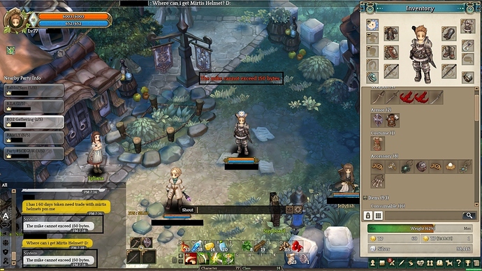Hey guys, Every time I try to link some items in the shout chat this message appears “The mike cannot exceed 150 bytes.” and I do not really know how to solve it. This problem is really annoying because I can not sell anything that way if not in the market. I wonder if there is somebody else with this problem to link items in the shout chat and IMC team already is trying to solve the problem . Thanks for listening!