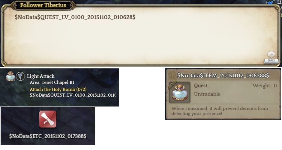 Follower Tiberius’s quest “Light Attack” is missing dialog text. The item given is also missing its item name. Some additional steps are missing translations (such as when used incorrectly).