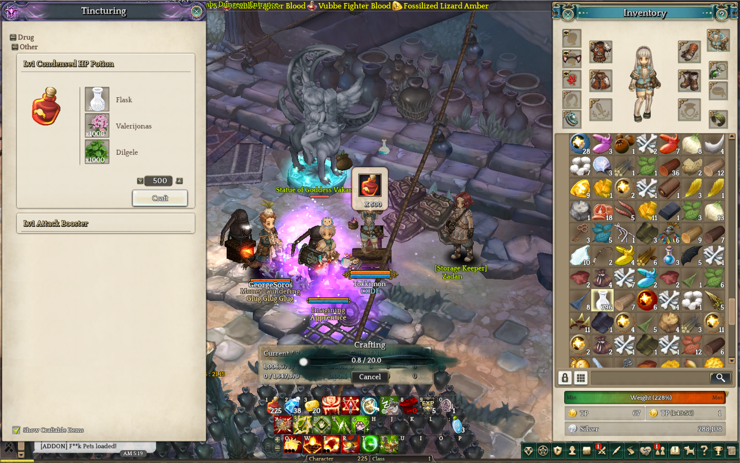Tincturing is being interrupted by something… I don’t know what it is. I can’t AFK while crafting potions. I’m so tired of baby sitting 1k+++ materials every damn time. This issue has been reported for so many times now and solution was not yet given. Other Alchemists are fine with crafting but I can only craft like 2~5 times per Tincturing. I’ve not experienced any internet connection problems and there are no lag spikes when I am crafting. I also craft on fewer channels to test if it’s really because of lag spikes, but still… it’s getting interrupted every damn time.