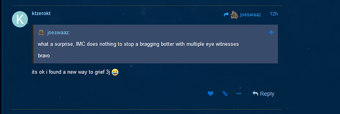 to be clear, this post is not about what happens at bee farm: it’s an open game, and you’re free to play it as you like. This report is about coming to the public forum and bragging about the different ways that you can harass a person. What you’re doing is a clear violation of the EULA – and you don’t even deny it. you brag that it will be “a slap on the wrist.” That’s disgusting, and clearly flaunting a total disregard for the game and its community.
