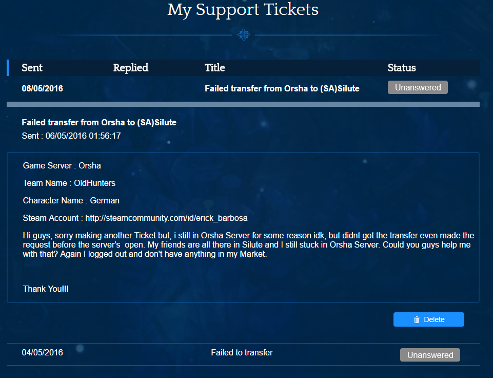 Hello, want to know why my Characters wasnt transfered to SA? I requested by token, and now in my tickets, my request is gone. Now already write 2 new Tickets, and I still didnt get an anwser about that. Could someone help me? I alone now in orsha, all my friends are in Silute and now Orsha is dead.