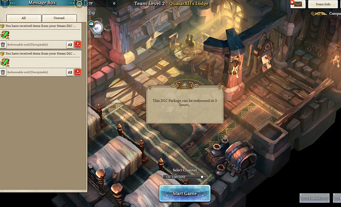 I purchased 2 DLC packages from steam store. However, when I try to access it in the lodge, it simply says “This DLC Package can be redeemed in 3 hours”. However, despite waiting for more than few days, it never came through. I tried it in many different ways, but it seems like none of those work. Please help me to retrieve these DLC packages!