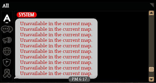 Didn’t see another thread for this, so here goes. When entering a mission or dungeon (appears to be any), you are spammed with a system message “Unavailable in the current map.”