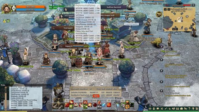 Note: the gold seller is using a script that allow his character to automatically run around, using whisper channel to spam their message despite being blocked by player, and automatically switch channel when get report.