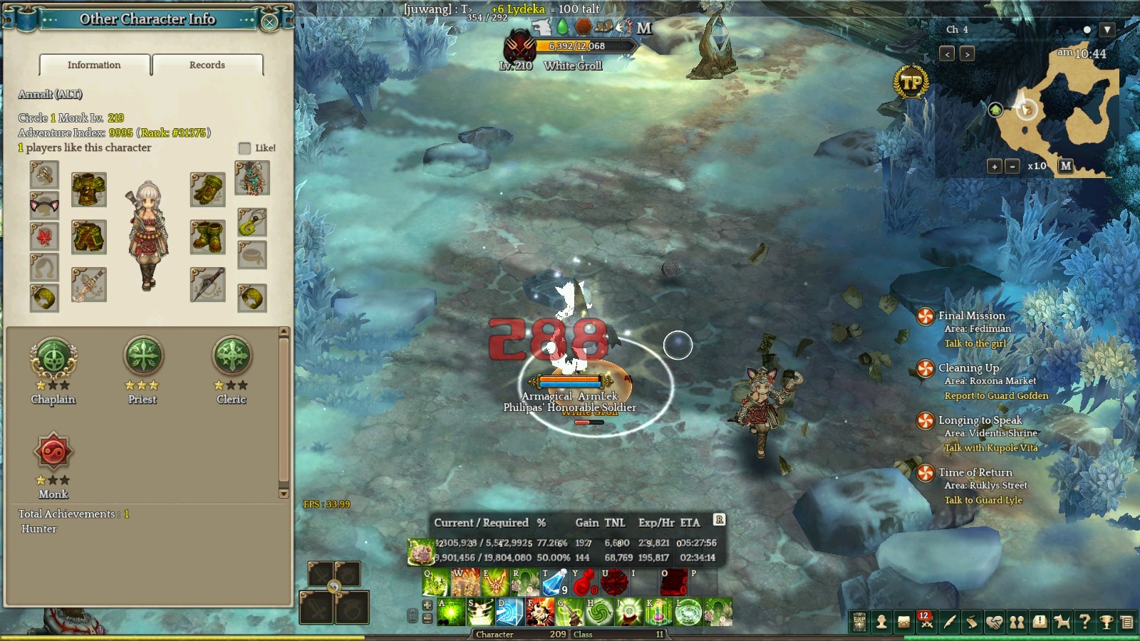 I have seen this bot since yesterday morning running 24/7 with the same pattern and there is no reaction when talking to her. This bot also switches channel in order to farm monsters continuously, I found her in every channel. Furthermore, her adventure index is around 9k which is extraordinary low comparing to her level.