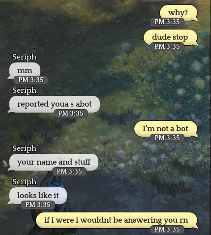 Hi there, so today I was grinding at dina bee when suddenly I got a trade request. I declined it and I instantly replied ‘why’ but then s/he sent me another trade request which I also declined. Mind you, I’m not a sorc. I’m a pyro2 ele2 and I wasn’t just auto attacking.