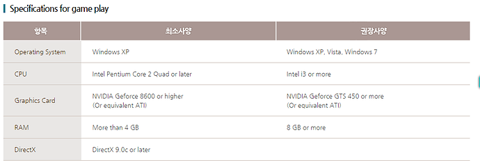 Taken off ToSNexonKR site. (left tab is Minimum, right tab is Recommended)