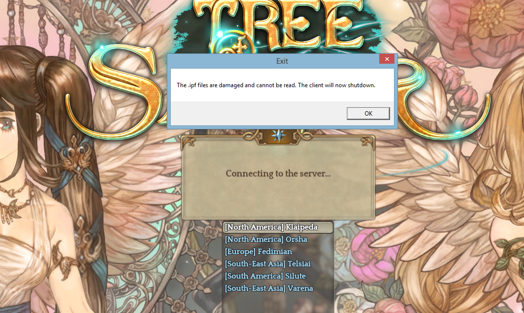 Serverlist loads fine for me too, Iâm not getting that âToS1/ToS2â list. However, Iâm getting the same message as Alyosha - ipf files are broken and client shuts down.