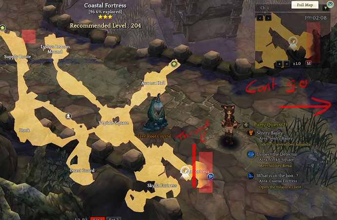 Does anyone know how to get to this quest? When I walk in the general area, I can’t proceed because the camera stops moving and there’s like an invisible wall I marked in RED that I can’t pass.