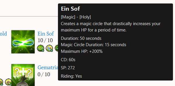 Ein Sof from kabbalista :lv5 +100%max HP, lv10 Ein Sof grant 200% max HP just like before.
