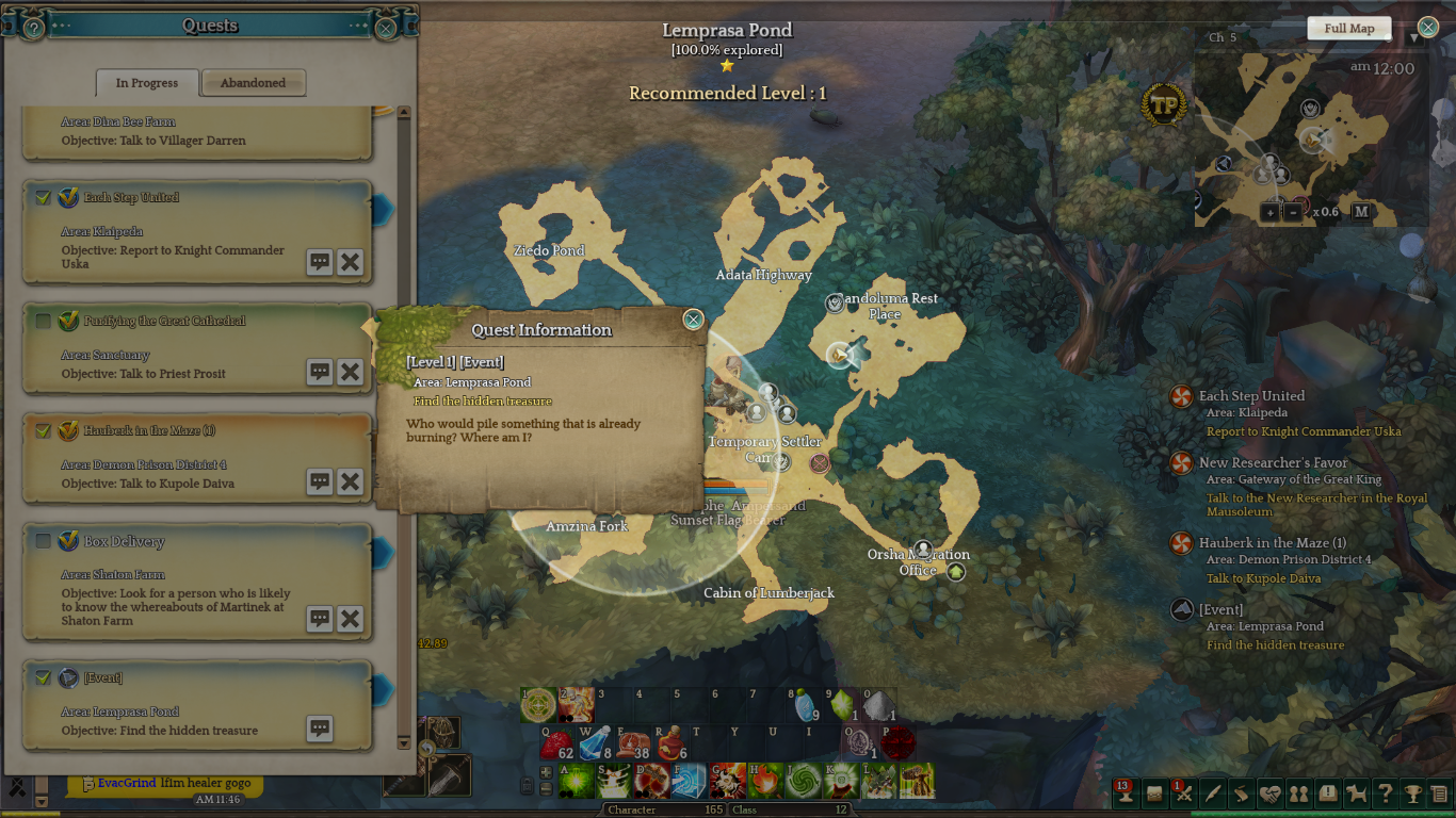 Hi guys, the event spot in Lemprasa Pond* (if you havent foud it yet) is in Amzina Fork. In the lower left part thats sticking out, there’s some firewood there. You just have to go around that part until the msg pop out (iirc i got it right over the firewood but i could be wrong but i definetely got it there).