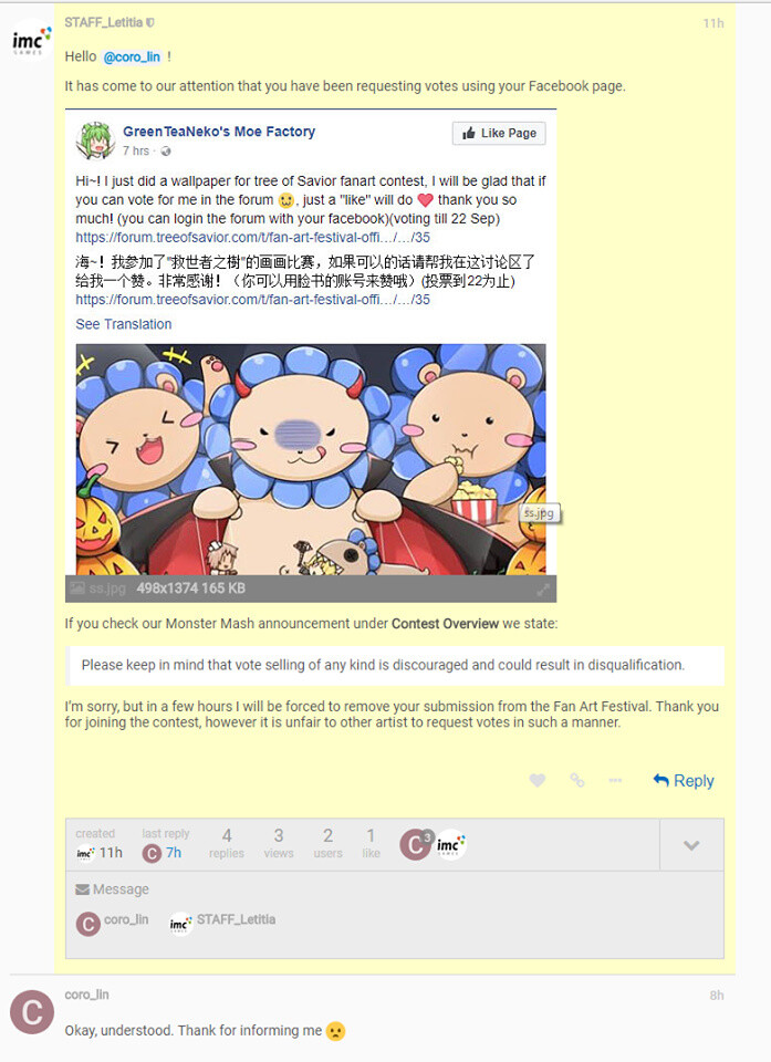 but didnt mean i agreed on staff’s judge. cuz she following all the rule and her intended is to share to her fans about her game FA. which is staff need to use consideration to judge that she intend to buying vote or just to share it out