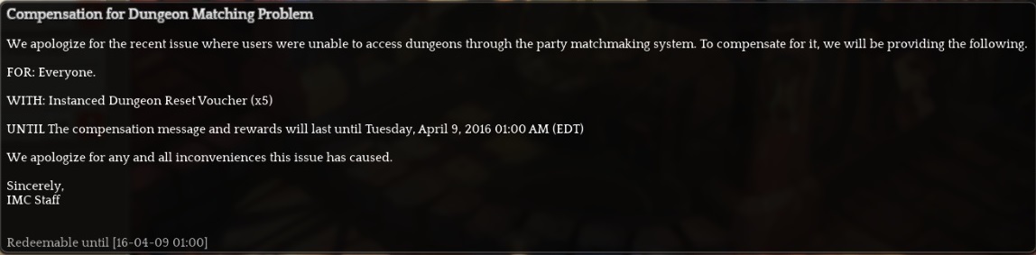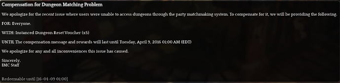 The idea is that you are suppose to see the compensation, and immediately redeem it on the character that was affected by the service problems. Not to let it sit there indefinitely so you can redeem it on a new character some time in the future.