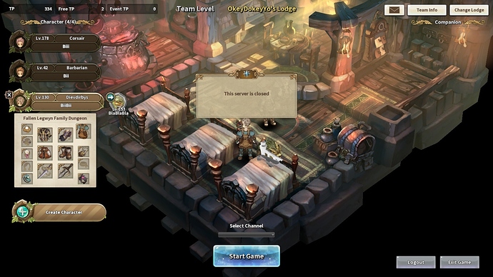My guild master and other party members had already in the lvl 130 dungeon, and i was located at Forest of Prayer. However, my guild master used the skill of Summon Guild Member and i was summoned to the dungeon. At this point, i did not get into the dungeon and my game did not respond. Therefore, i tried to re-login. At this moment, when i was trying to log in with my character of dievdirbys, i did not see there’s any channels for me to enter the game. And the system showed me that " the server is closed". But, i can still login with my other two characters, just only my dievdirbys character.